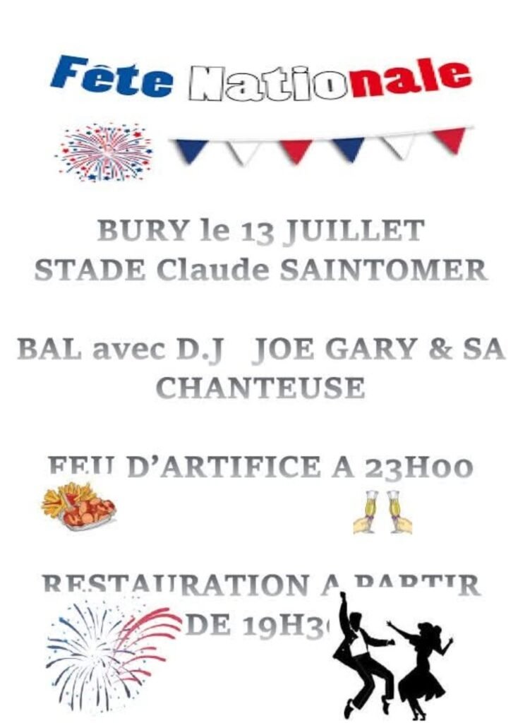 Le dimanche 13 Juillet 2025, le comité des fêtes de Bury vous convie aux animations organisées dans la cadre de la fête nationale. Bal animé par « DJ Joe Gary et sa chanteuse » à 21h. Il sera possible de vous restaurer sur place dès 19h30 (sandwichs, saucisses, merguezs, frites, boissons, …).