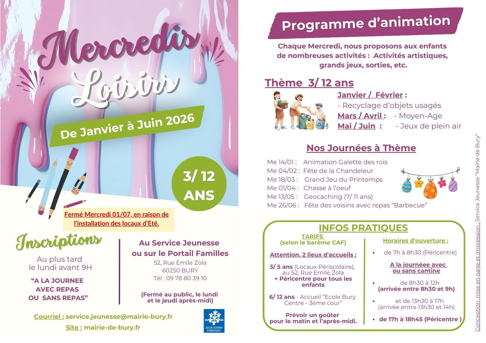 (de 7h à 8h30 et de 17h à 18h45). - 6/ 12 ans – Locaux Ecole Bury Centre (3ème Bâtiment), Place Charles de Gaulle